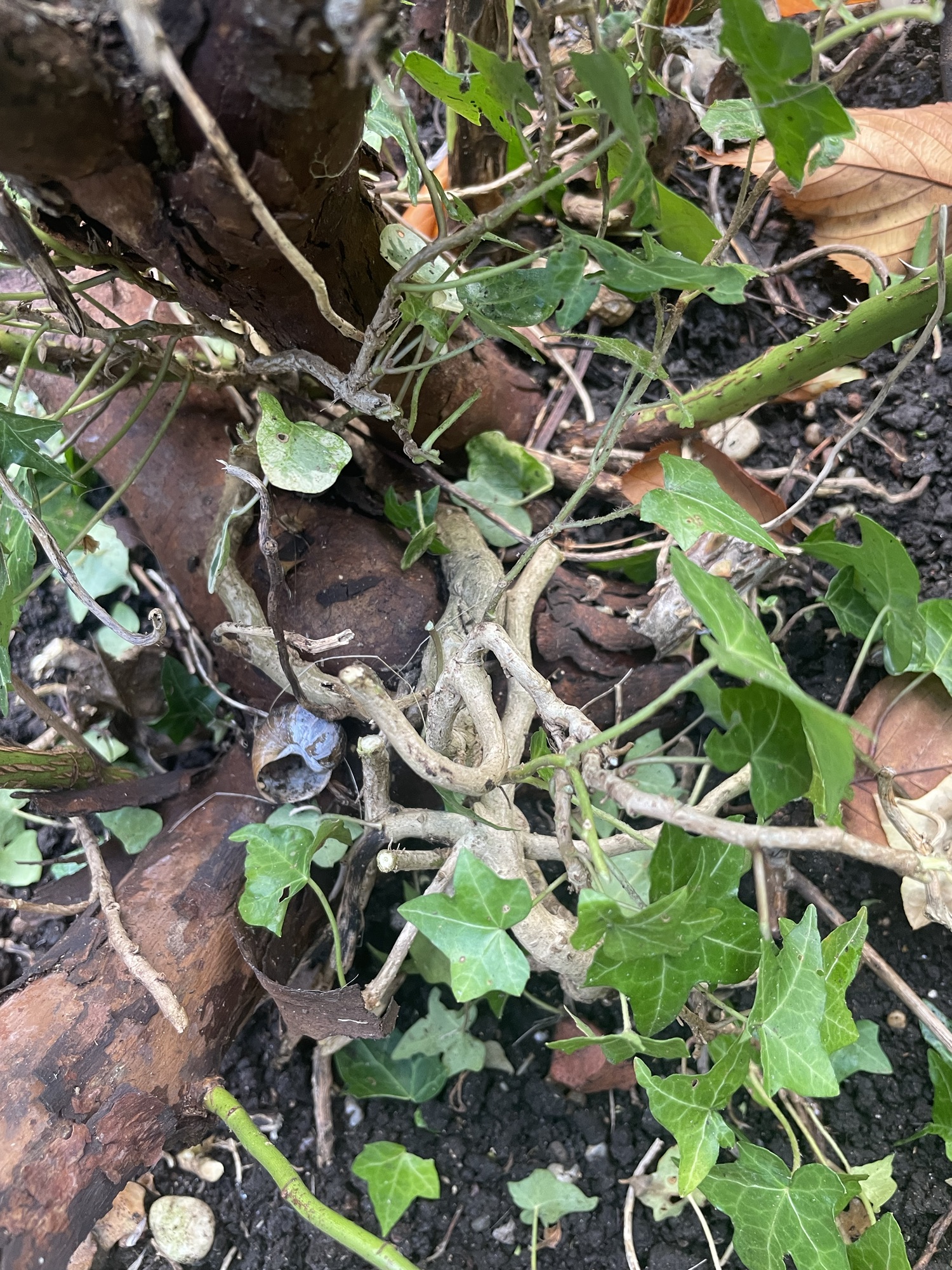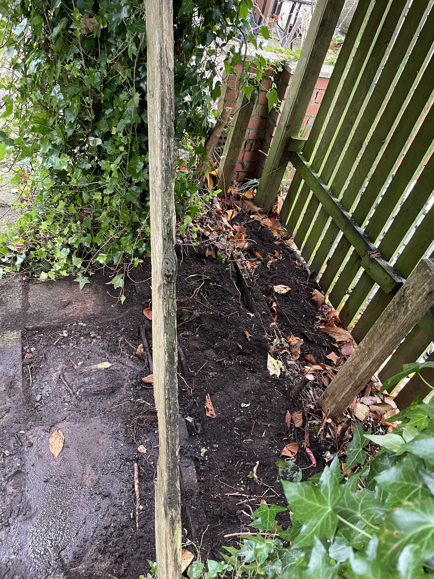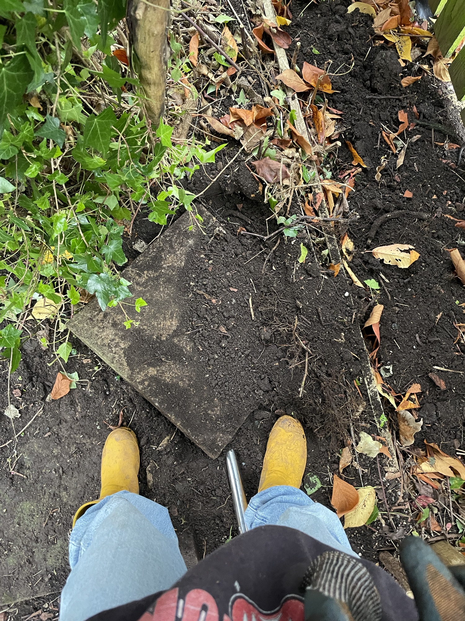 In the very final warm days I decided to try clearing a little further back. I’ve mainly been putting work into the patio area and the long, skinny beds along the side. However, the ivy “tree” we have growing at the beginning of the path was surrounded with weeds and dead branches and garbage and I wanted to give it a good clean so it was less of an eye sore. Ohhh boy was it a mess! Beyond clipping back the ivy, I also uncovered a decaying picket fence and scalloped pavers! I was able to tidy it very nicely and give myself a better idea of its potential. I think I will make it into a little hidden flower bed for some shady varieties and maybe hide some gnomes and fairies under the cover of ivy. I had to pull out some of the paving slabs that were tipping out of the soil from the massive roots pushing from underneath. So my plan is to leave those tiles out and just extend the bed forward, then hide the roots with mulch and trailing flowers.
