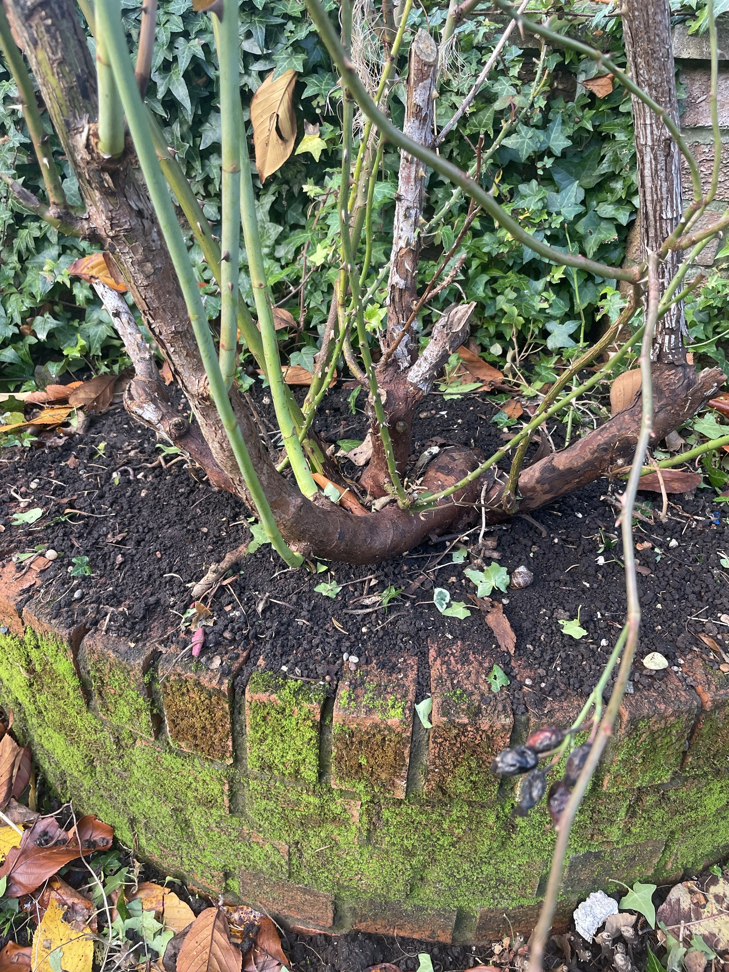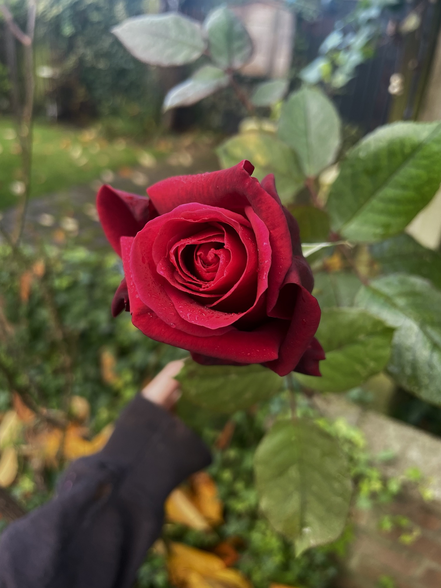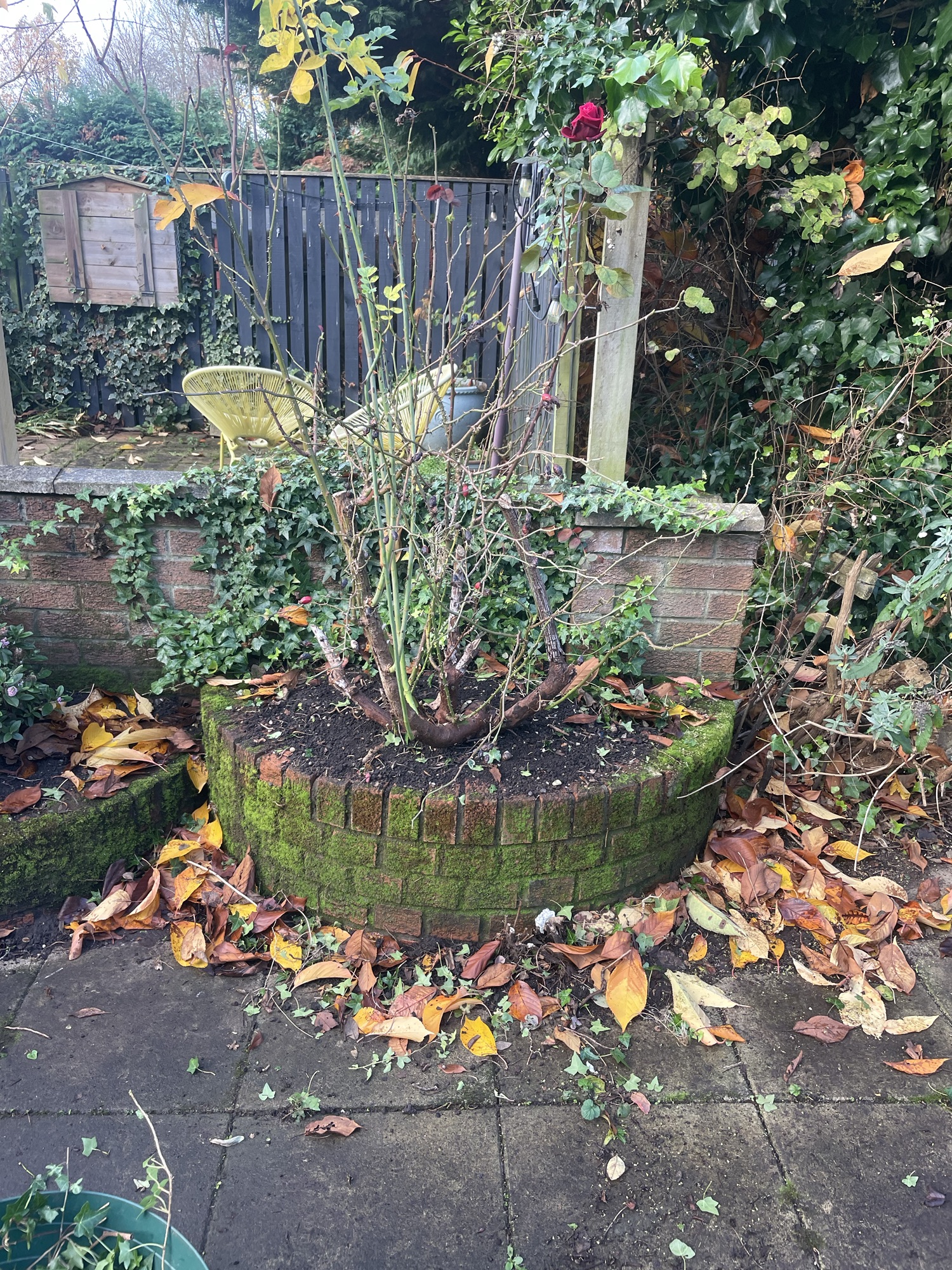 Next up was tidying our red rose bush that is growing in one of the raised brick beds. It was completely drowning in ivy vines and I wanted to cut all of that back. My intention was to uncover the rose in order to move it to the front garden in its dormancy period, but after seeing how big the trunks were at the base.. I’m unsure. It seems so happy and has grown very well there, I would hate to move it and risk killing it. However, I thought it would fit the romantic color palette I intend to design with in the front garden better. It also risks being battered by rouge footballs when it’s in the back garden- I have seen it happen. I also reasoned I could leave it for another season and try propagating it in the spring. That way if the transplant doesn’t go well I have back ups, and can preserve it. It’s the most beautiful plant the last owners left and I would like to keep that part of the garden’s history for us to enjoy. It gave one last bloom before the frost came- what a stunner.