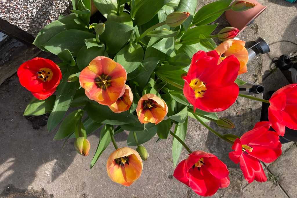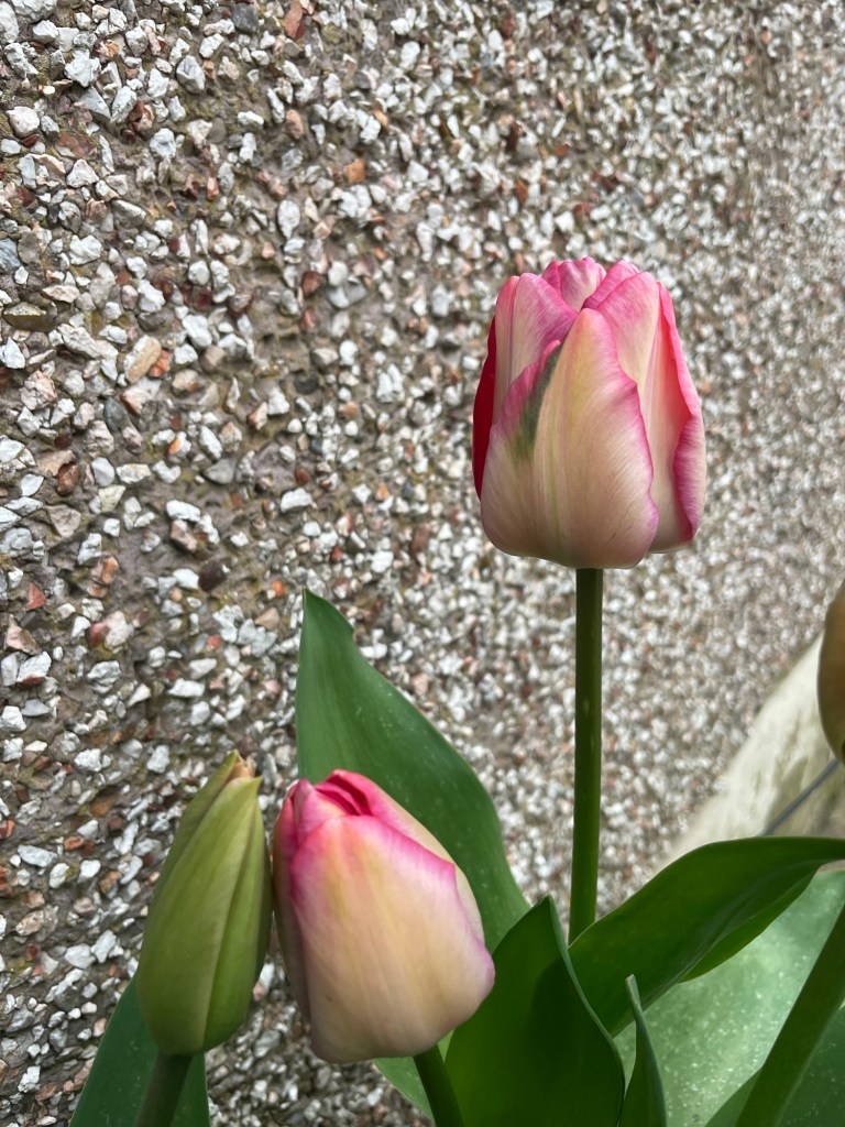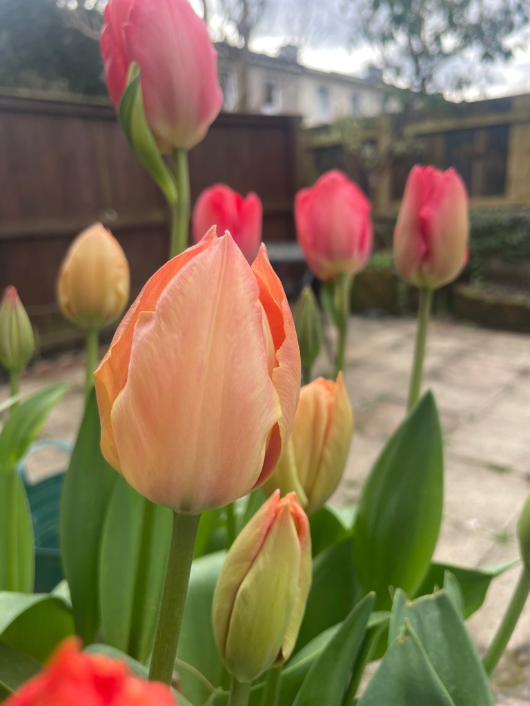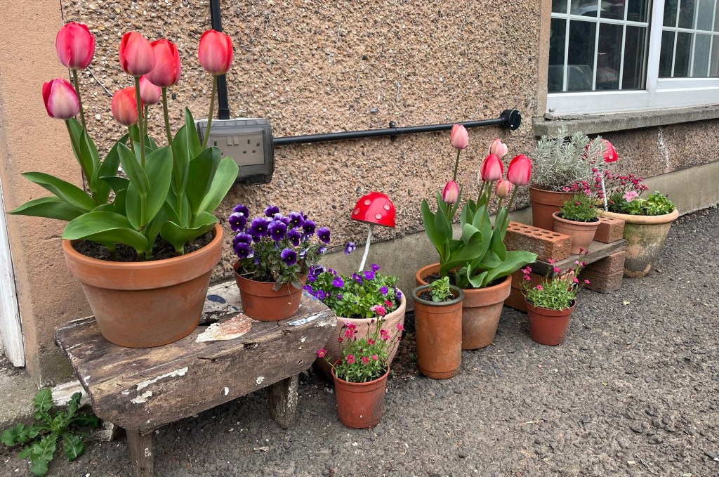 I grew all of them in pots this year because I was working in the garden beds all winter. I bought a few bags of “pink” tulips from a grocery store but they are coming up in mauve, peach, and red. All of them very tall too! It’s been my favorite spring habit to go outside and see how they are coming along.