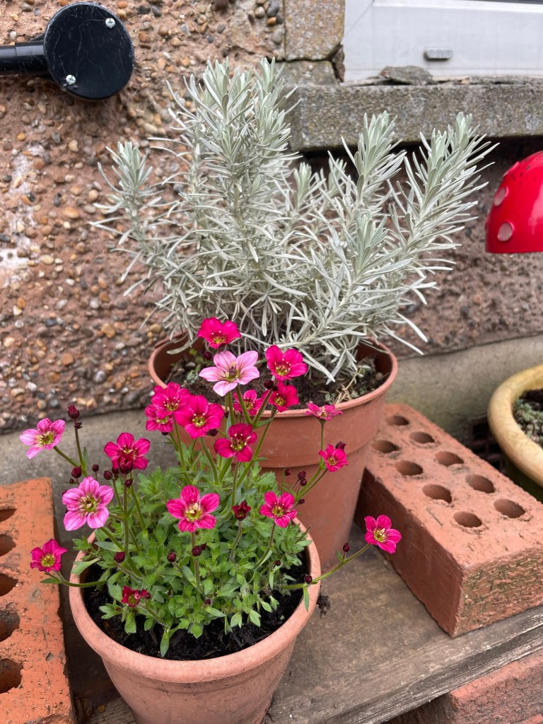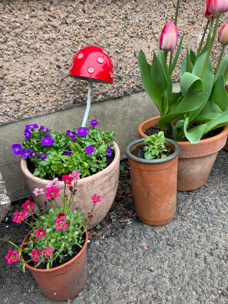 I also cleaned up a couple of my front pots! I was going to leave them until closer to summer, but thought they’d look so sad next to my pretty tulips. There wasn’t too much to pick from at the garden center this early, but I tried to pick things the slugs might leave alone. So I planted purple aubrieta, pink petunias, and rosey saxifraga. They all have textured foliage that appears to be keeping the slugs away. (I also have two pansies that are still going from last year, but the slugs have just discovered one of them, rip).